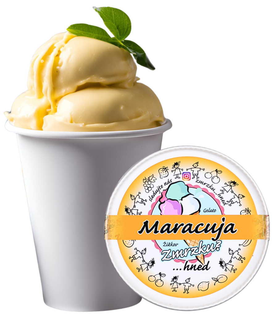 Složení: Mléko, smetana (18 %), cukr, maracuja pyré (15 %), sušené mléko odtučněné, stabilizátory: guma guar, guma karubin. Skladujte při teplotě -18 °C nebo nižší. Po rozmrazení znovu nezmrazujte. Při -18 °C minimální trvanlivost do: viz datum na spodní části obalu. Výrobce: ZMRZKU HNED s.r.o., Mariánohorská 48/7 Praha 4.