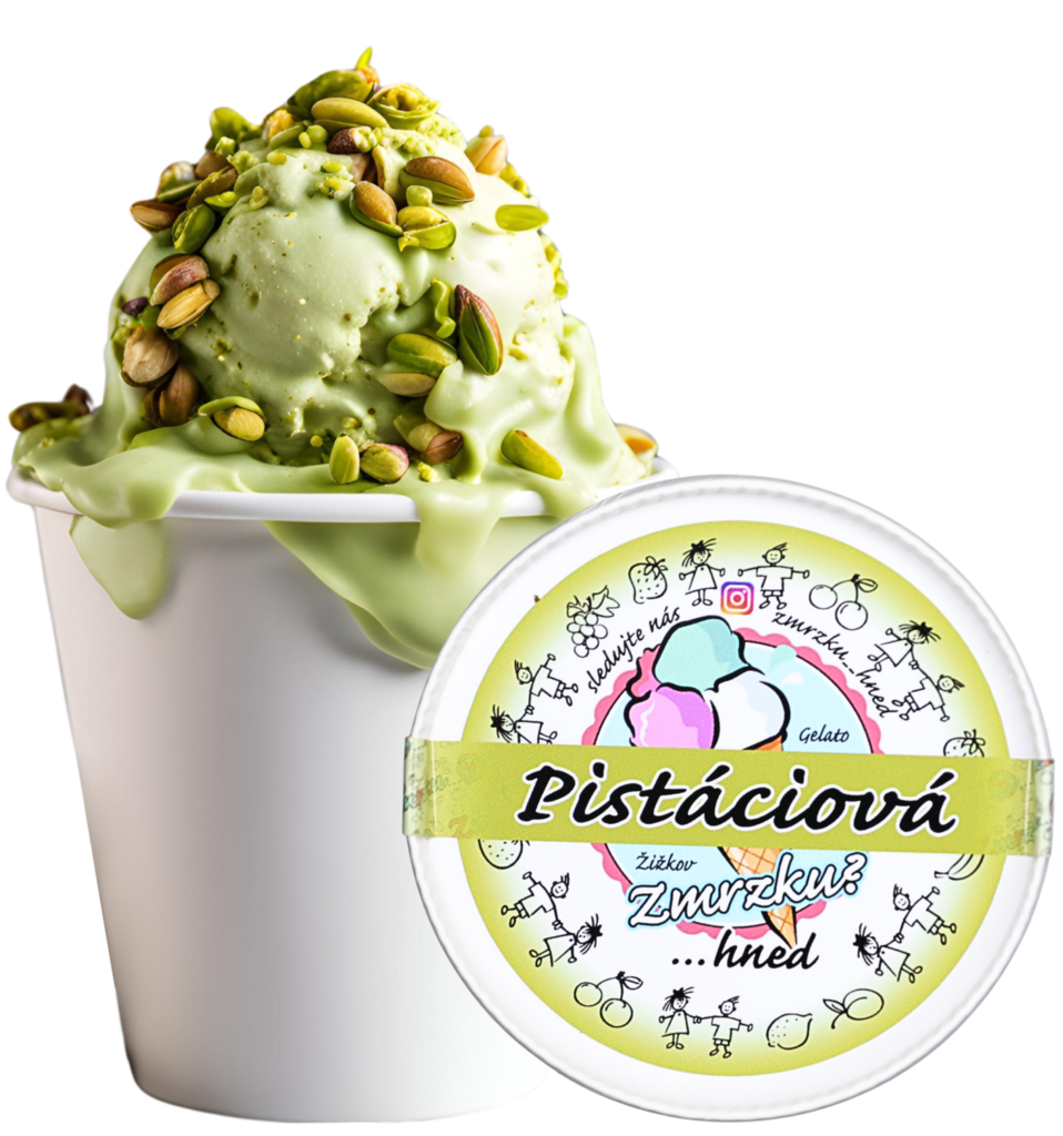 Složení: Mléko, smetana (20 %), cukr, pistácie (14 %), sušené mléko odtučněné, stabilizátory: guma guar, guma tara. Skladujte při teplotě -18 °C nebo nižší. Po rozmrazení znovu nezmrazujte. Při -18 °C minimální trvanlivost do: viz datum na spodní části obalu. Výrobce: ZMRZKU HNED s.r.o., Mariánohorská 48/7 Praha 4.